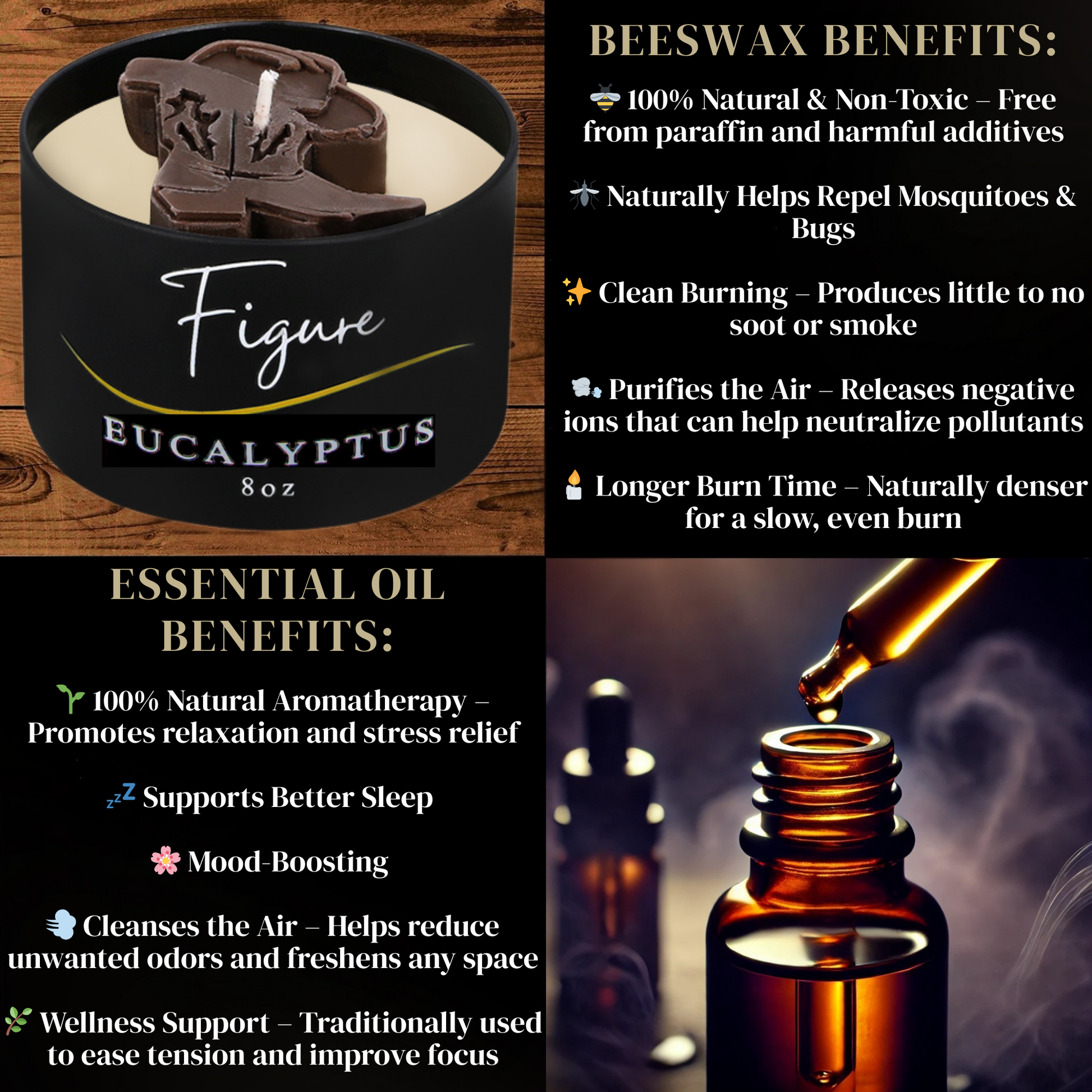 Crafted with care, each candle is made from a premium beeswax and organic soy wax blend, paired with a 100% beeswax wick for a clean, even burn. We use pure essential oils to create authentic Lavender and Eucalyptus scents, while Bourbon and Coffee Bean add warm, inviting aromas perfect for any season.