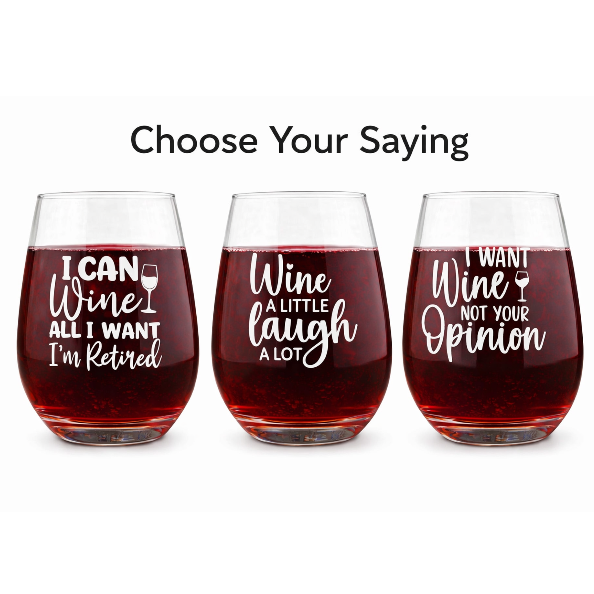 Stemless Wine Glass with Saying – “I Can Wine All I Want, I’m Retired”