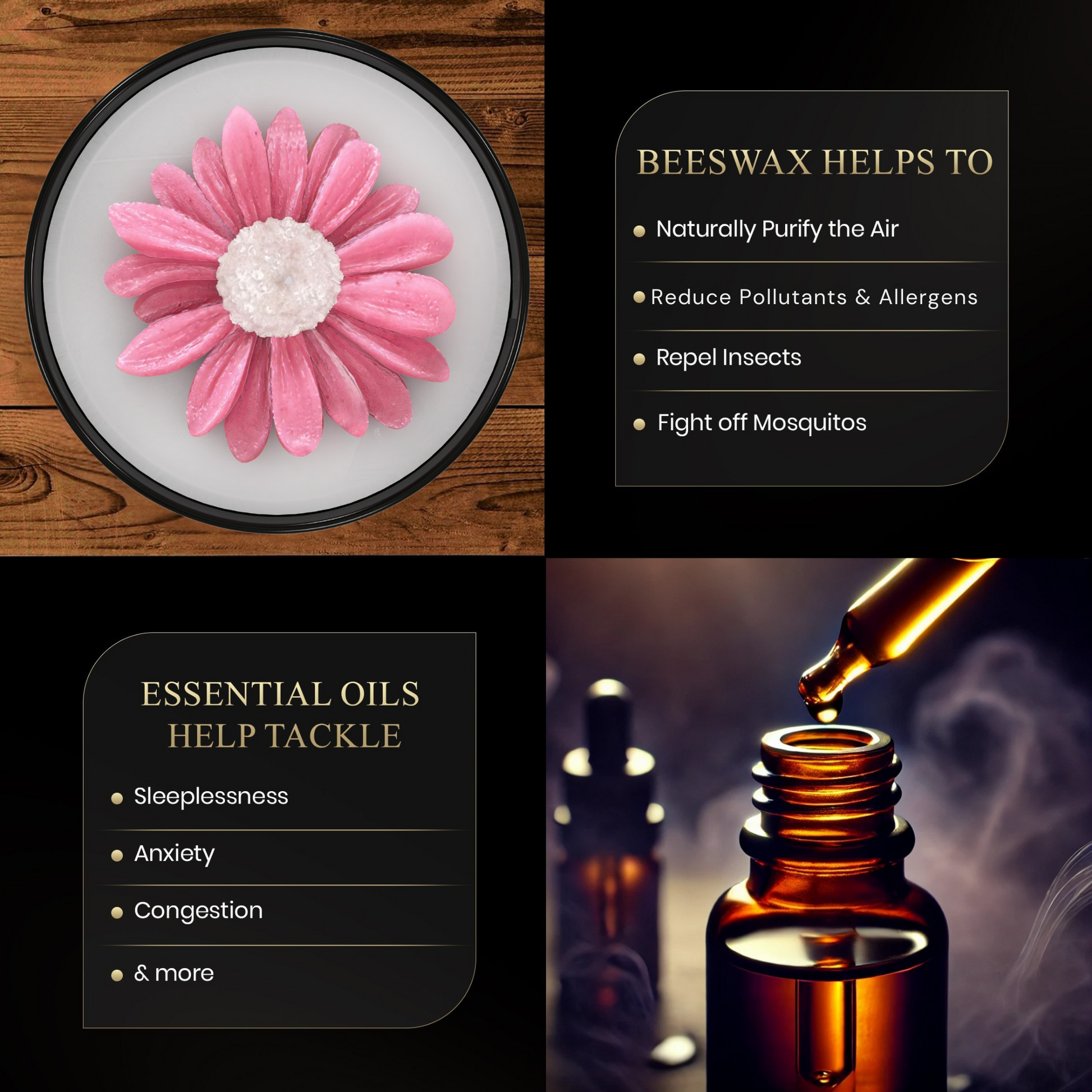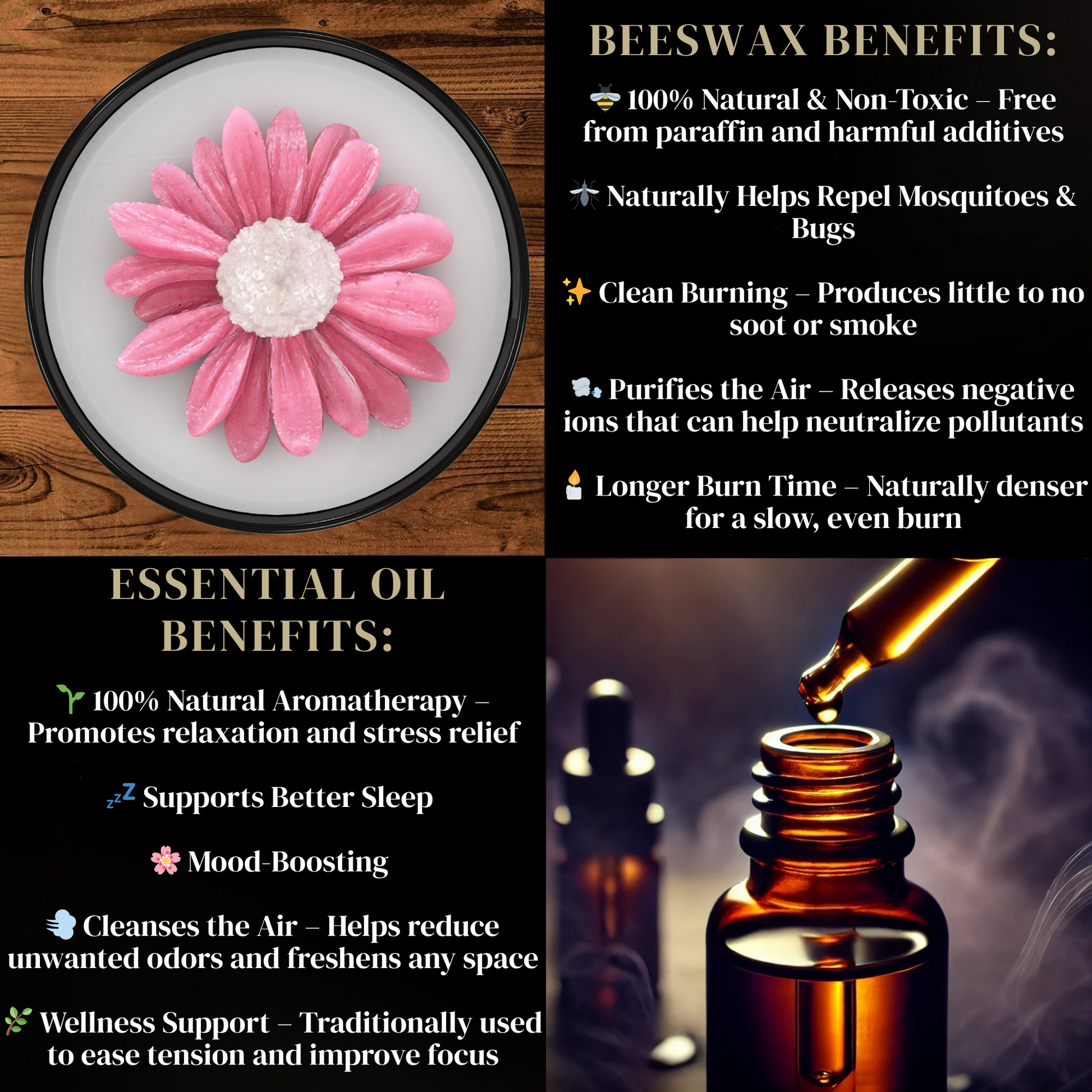 - AROMATHERAPY AND BEESWAX BENEFITS: Essential oil infusion creates a calming atmosphere while naturally purifying the air as the candle burns longer. Also helps to fight off mosquitos while helping tackle sleeplessness, anxiety, congestion, and more.